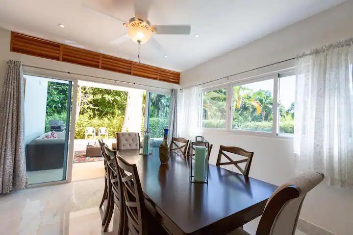 Televisor, 2 sofá camas, mesita de centro, mesa televisor, 2 abanicos, cuadros de decoración, comedor para 8 personas.