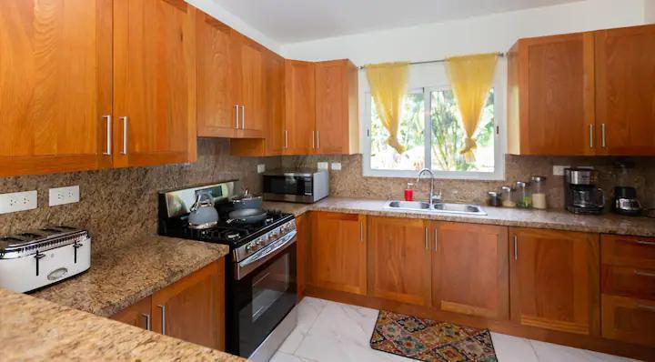 Estufa de 5 hornillas, nevera, meseta en marmolite, gabinete en cedro, microondas, licuadora, cafetera, tostadora.