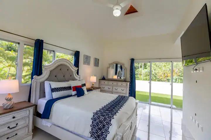 Cama king con espaldar, gavetero, 2 mesitas de noche, televisor, aire acondicionado, abanico.