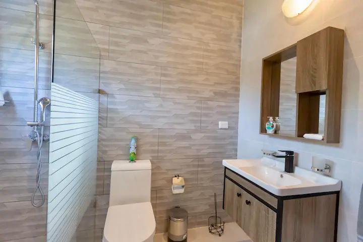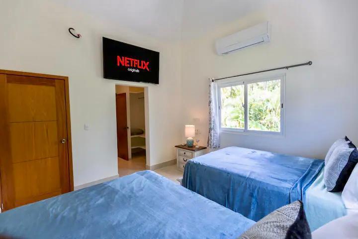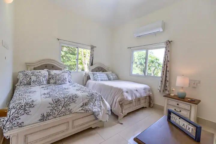 2 camas queen en cada habitación con espaldar, cada una con baño y closet, aire acondicionado, abanico, mesitas de noche y juego de cortinas. Una habitación con televisor.