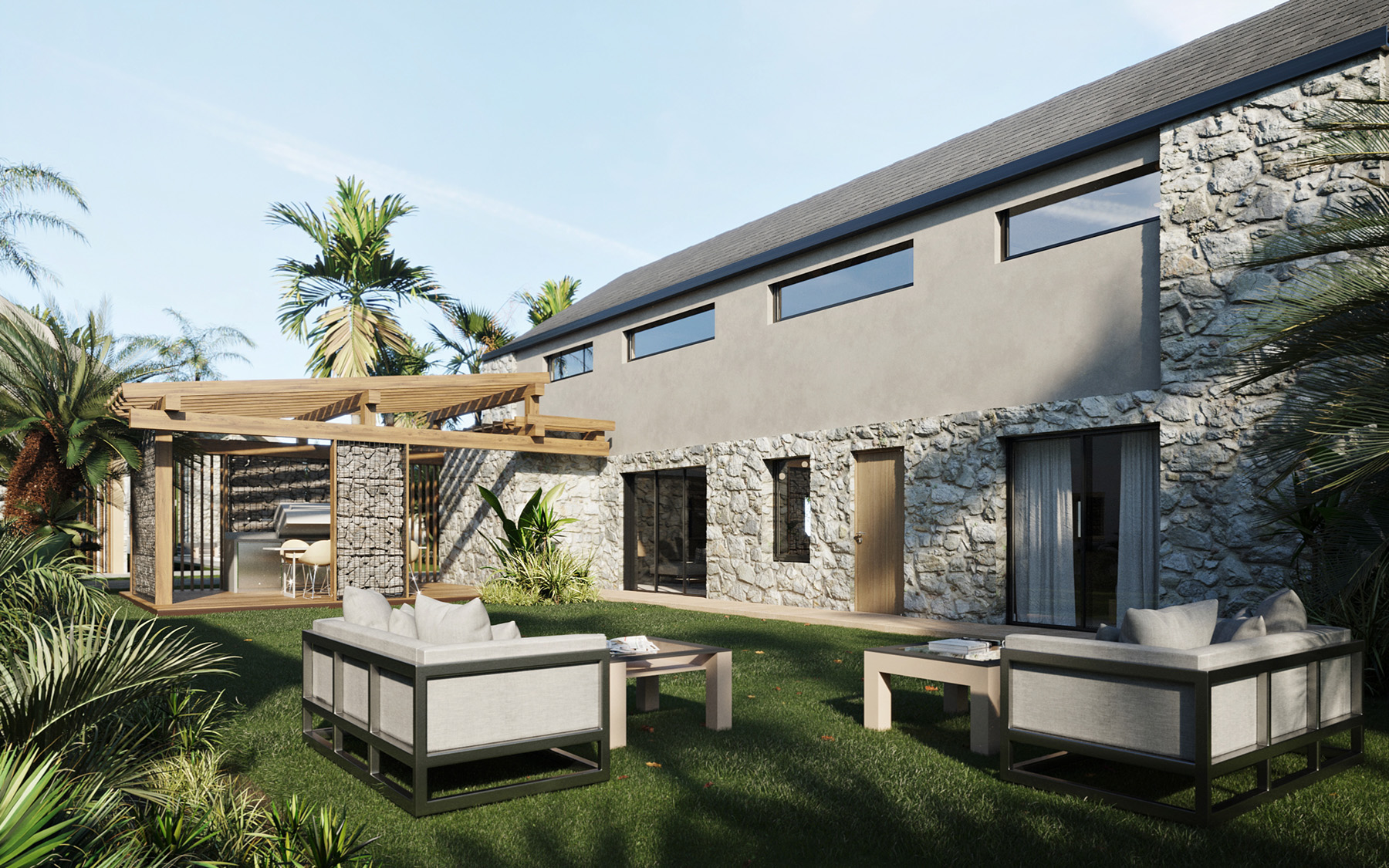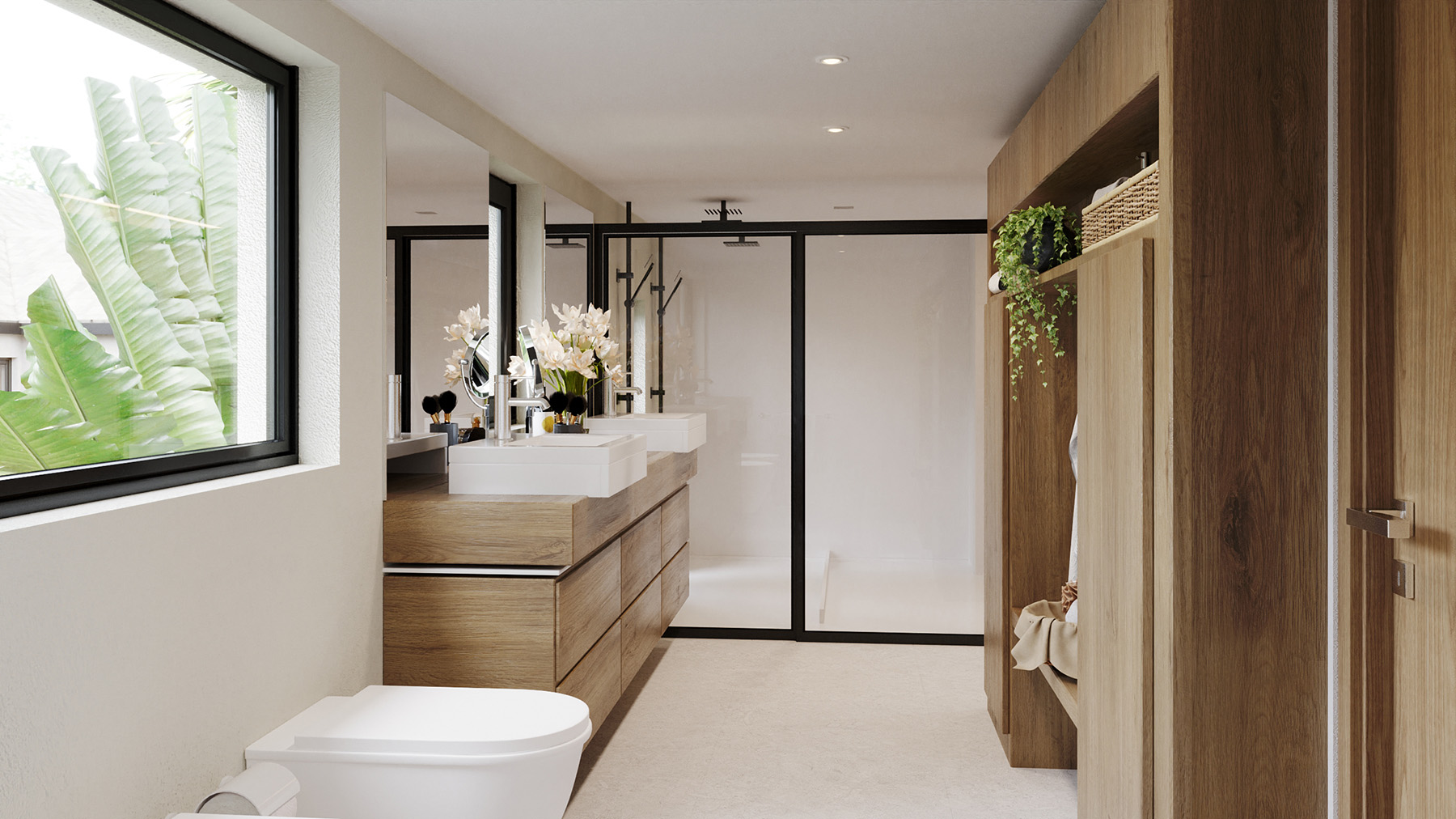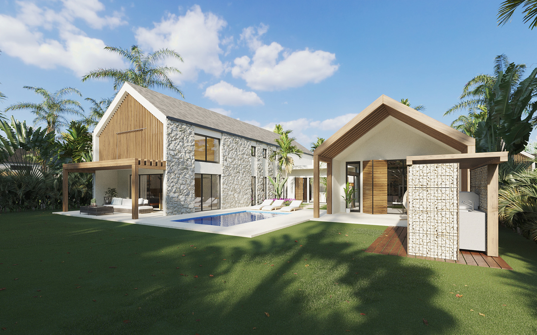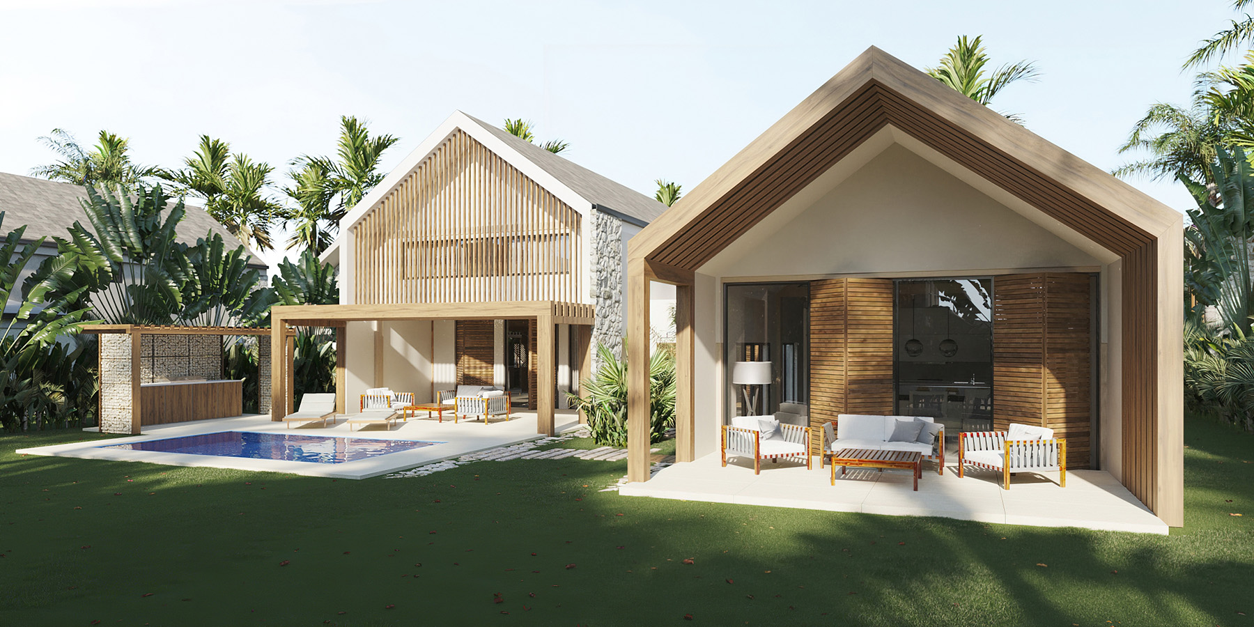Architecture and orientation of the villas are adapted to the movements of the sun to avoid heating of facades and glass, and to maximize energy use with solar panels.